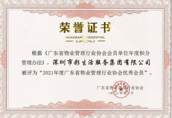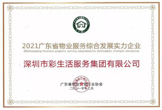 2021年12月15日,在廣東省物業(yè)管理行業(yè)協(xié)會“第五屆第五次會員(代表)大會暨理事(監(jiān)事)會會議”及“2021廣東省物業(yè)服務(wù)企業(yè)綜合發(fā)展研究成果發(fā)布會”上,彩生活憑借綜合實力和業(yè)界口碑,榮獲“2021廣東省物業(yè)服務(wù)綜合發(fā)展實力企業(yè)”、“2021年度廣東省物業(yè)管理行業(yè)協(xié)會優(yōu)秀會員”、“2021大灣區(qū)物業(yè)服務(wù)品牌企業(yè)”三項獎項。